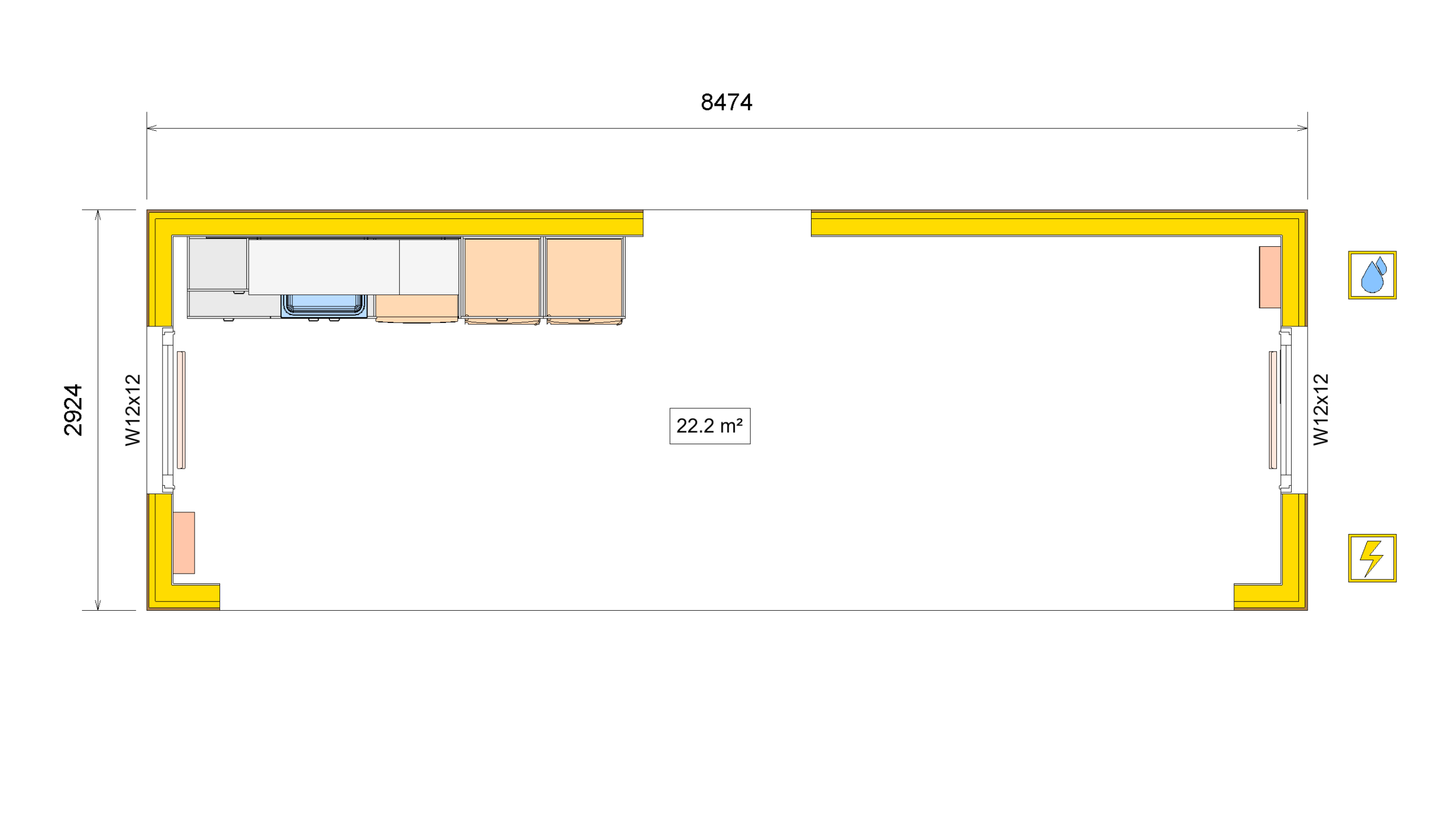 - Appliances options: H=180cm refrigerators, dishwasher, microwave ovens, cooktop, vent hood