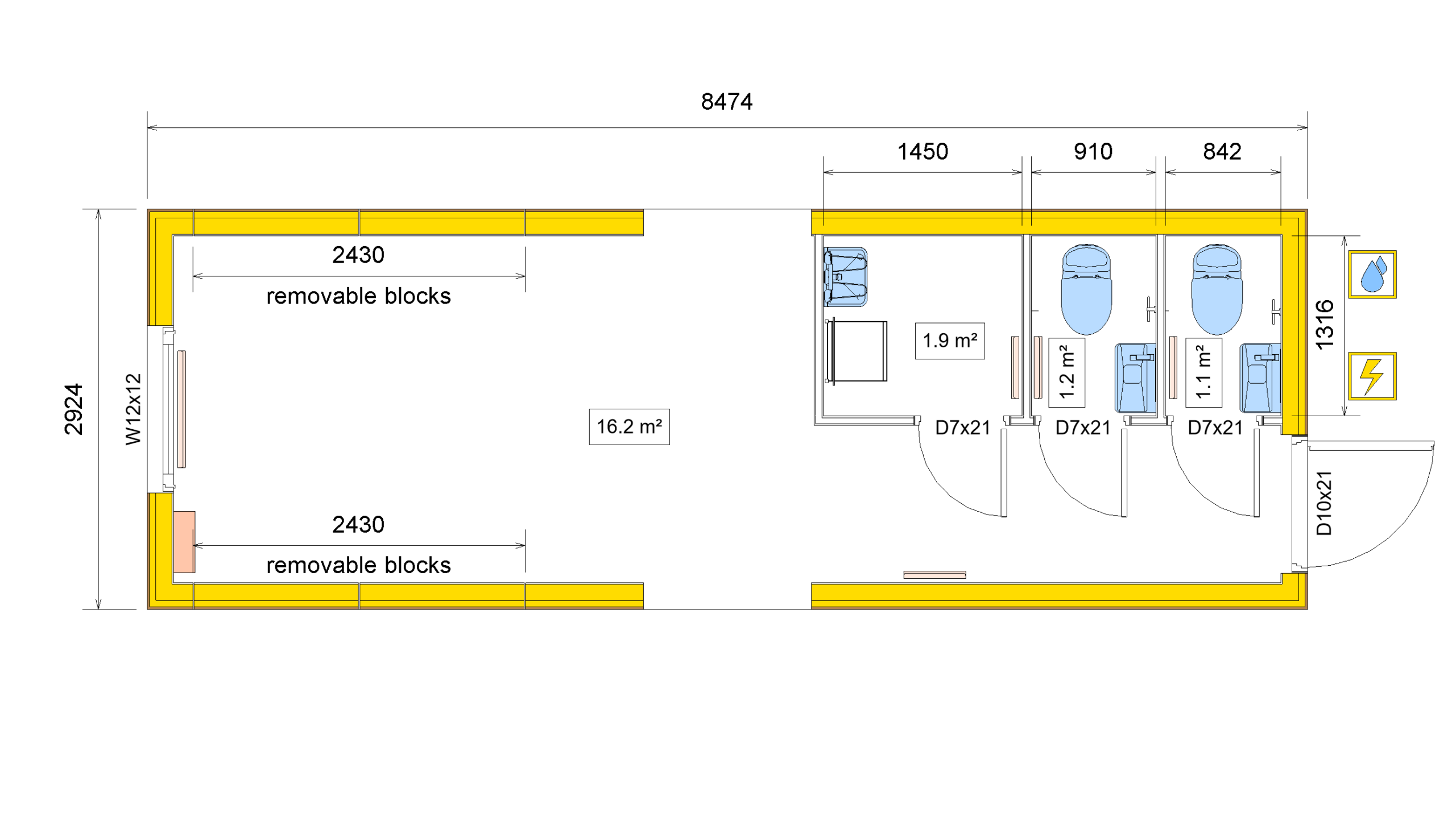 - 2 choices regarding external doors: either 9×21 steel door or 10×21 wooden door