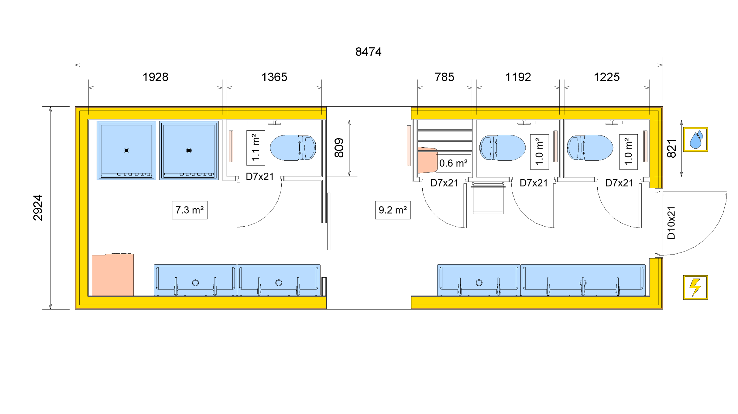 | Water & Sewage Connection | Water pipe Ø26,9 mm, Sewage pipe Ø110 mm |