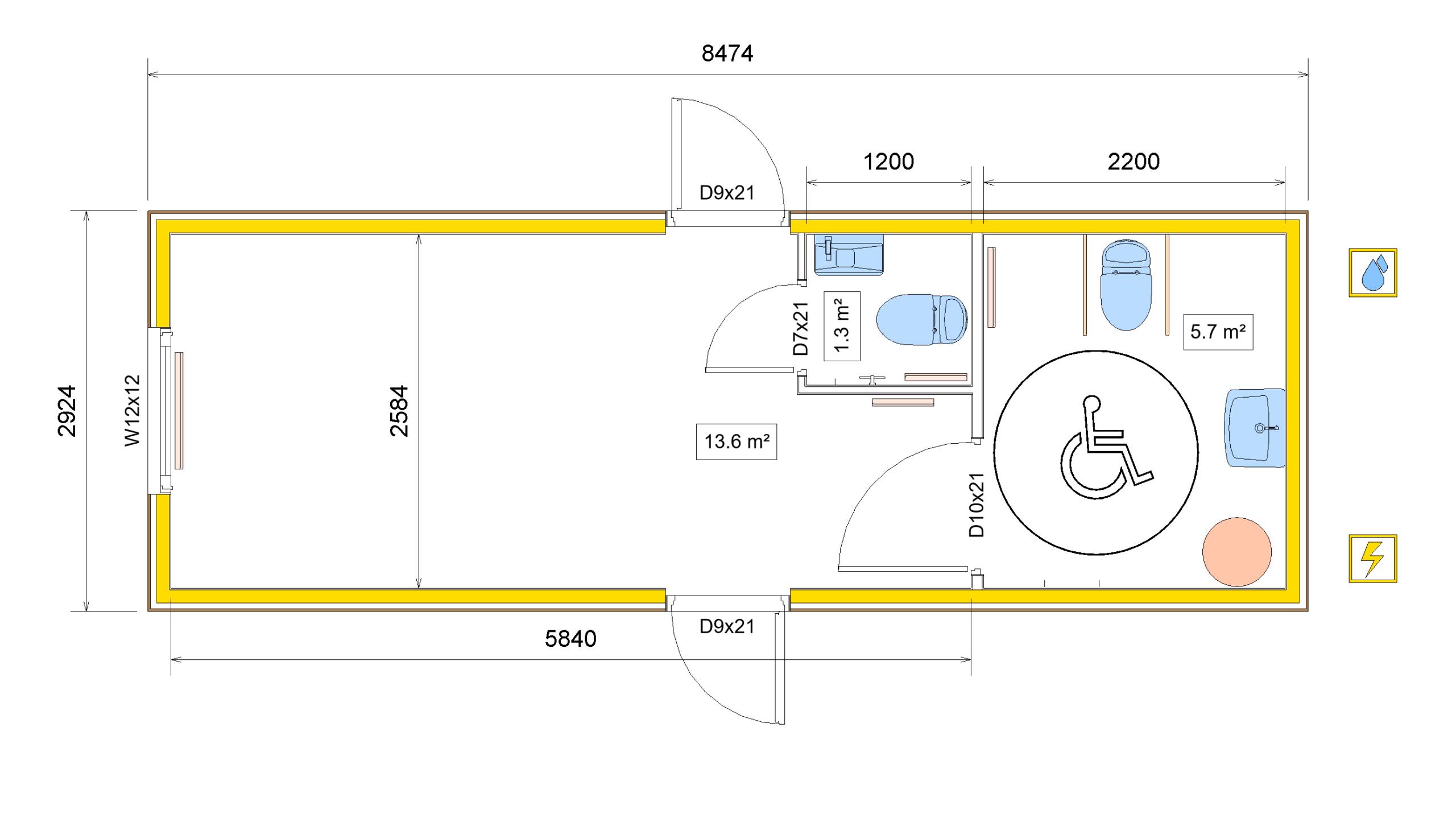 | Water & Sewage Connection | Water pipe Ø26,9 mm, Sewage pipe Ø110 mm |