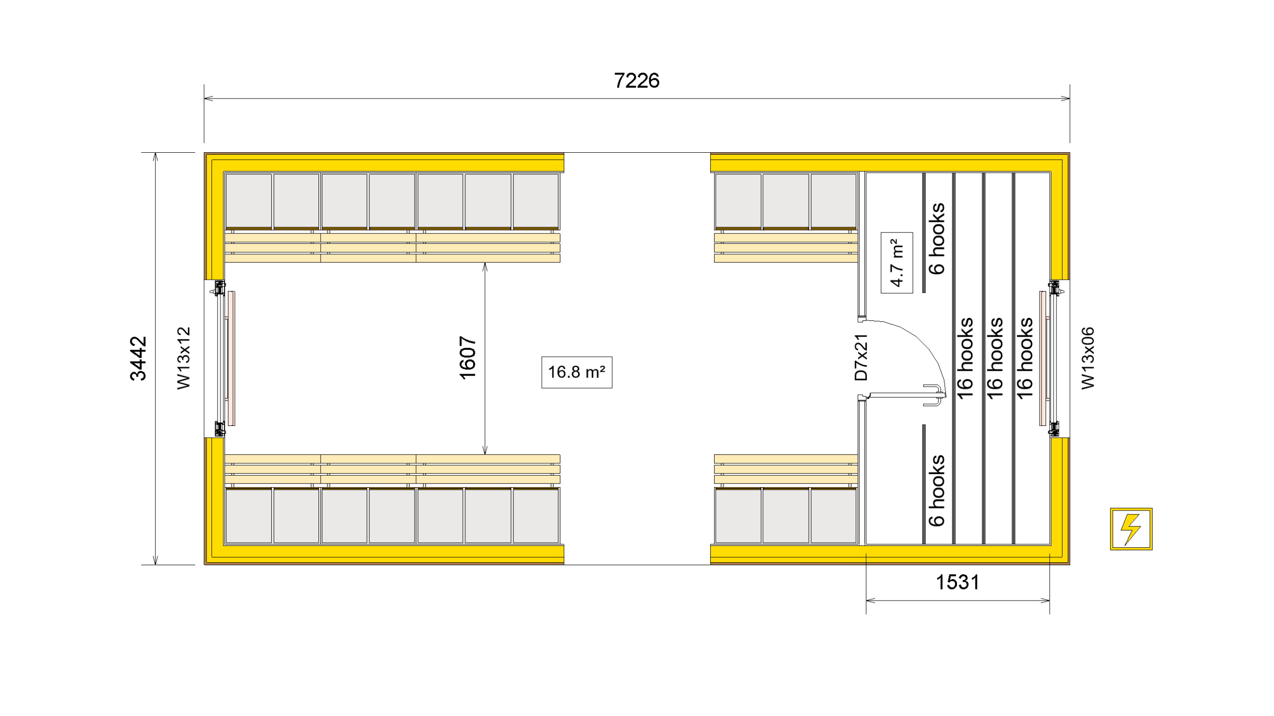 - Drying room (wall-mounted rods with a total of 60 two-armed hooks)