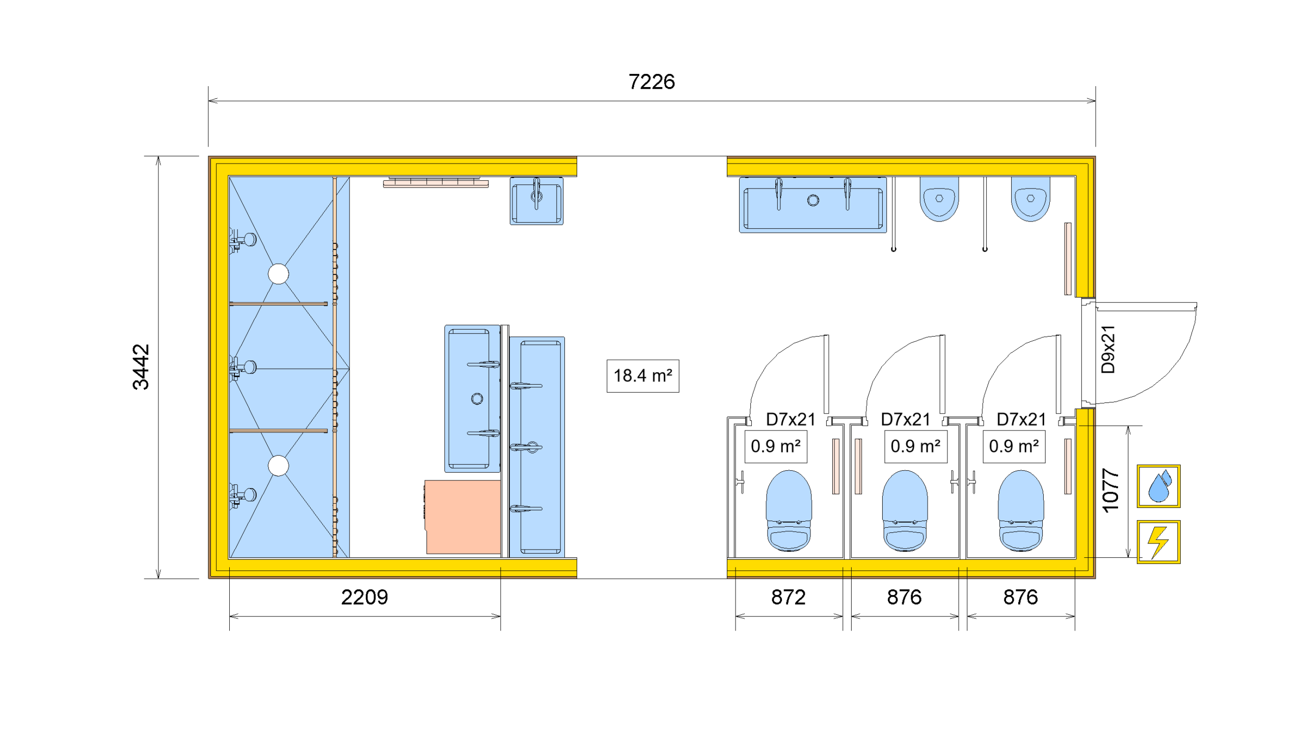 | Sanitary Features | Double-sink, Shower Room, Toilet, Triple-sink, Urinal |